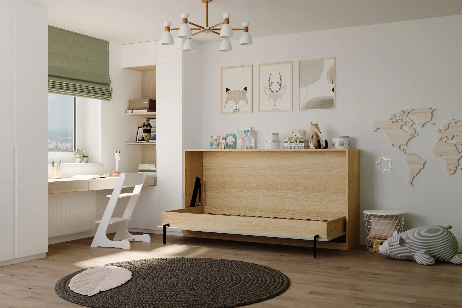 Детская горизонтальная шкаф-кровать "Little sleeper".  Работает на механизме раскладывания собственной разработки "Start". Кровать раскладывается легким движением руки, превращаясь в полноценное спальное место. Просто потяните ее за ручки, расположенные на фасаде и выставите ножки-опоры.