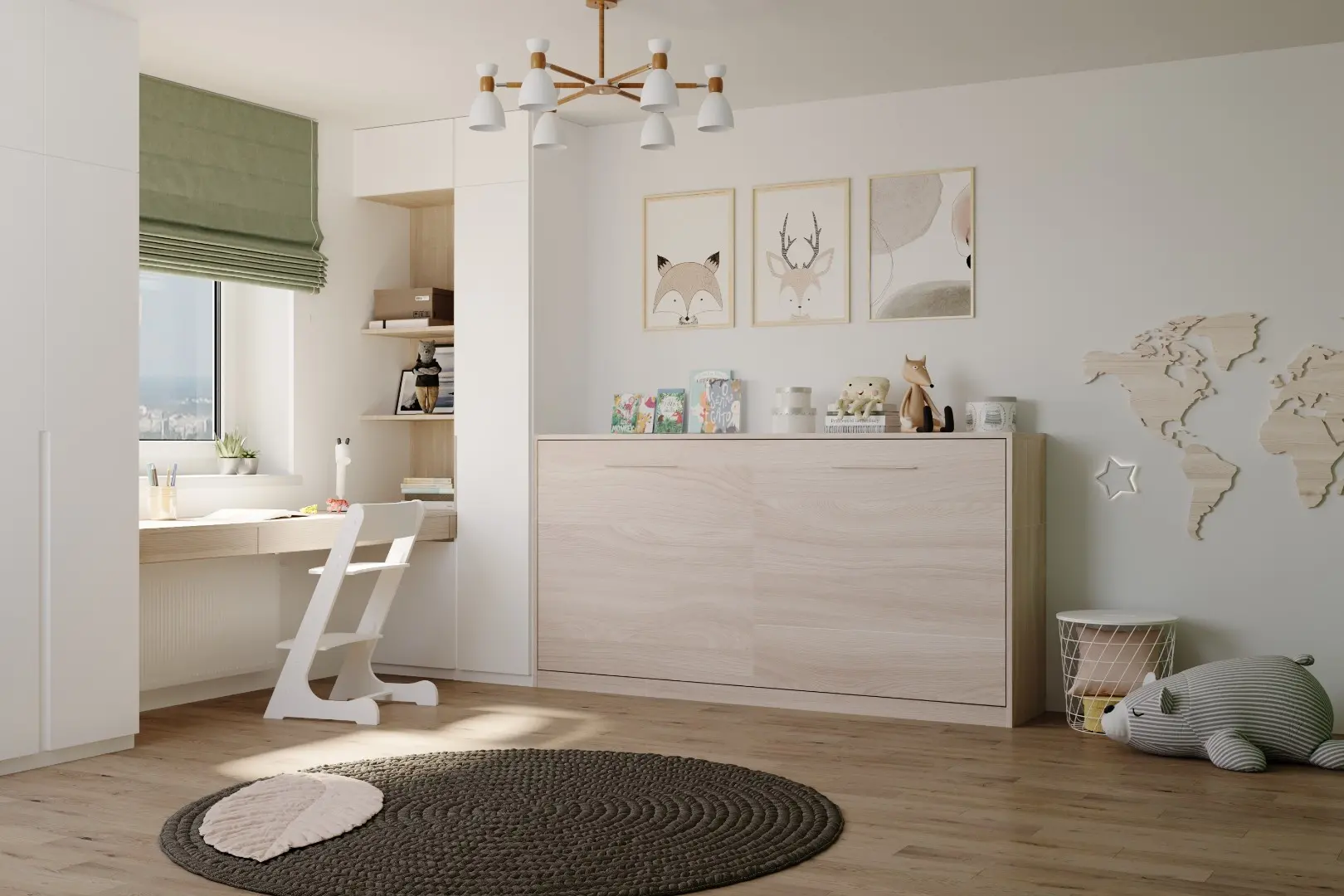 Детская горизонтальная шкаф-кровать "Little sleeper".  Работает на механизме раскладывания собственной разработки "Start". Кровать раскладывается легким движением руки, превращаясь в полноценное спальное место. Просто потяните ее за ручки, расположенные на фасаде и выставите ножки-опоры.